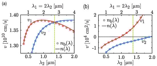The parameters v and are expressed by the refractive index : and , where the prime indicates the differentiation in . Knowledge of the dependences , with or without the geometric dispersion, enables one to calculate and as functions of and . Further details can be found in Section S2 of the Supplementary Materials. Expressions for detunings depend on the pumping scheme. For the FH pumping, and . In the SH pumping case, and .