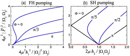 The normalized dependences of on the pump strength parameters for the cases of FH (a) and SH (b) pumping. The curves are relevant to different values of the phase . Zero detuning case, , corresponds to . The horizontal red line in (b) is related to the single background state , .
