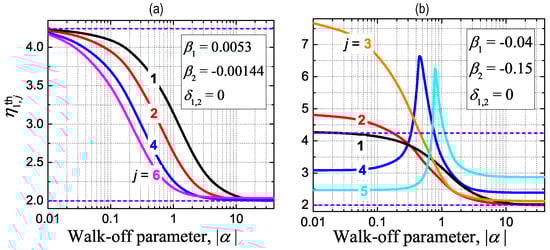 Nevertheless, a general overview and illustrations of the threshold properties, which do not pretend to be complete, are possible. We introduce first the normalized pump amplitude ; this normalization is different from that relevant to the SH pumping. The presence of parameter , ranging from 0 to very large values, in the threshold equation raises questions about the effect of walk off. It turns out that the lowest threshold value of at a zero walk off () corresponds to , i.e., to an internal instability of the dual background []. For detunings , this value is minimal, . With increasing , some quartets with quickly become the easiest to excite. However, the optimal values of depend significantly on the dispersion coefficients. This is illustrated by Figure 6, which was obtained with the use of numerical methods.