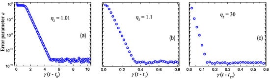 Figure 7 shows three examples of the temporal evolution of relevant to our adiabatic procedure applied to the antiperiodic case at s and ; the parameters , , are representative for a close vicinity of the zero walk-off point in the LN-based resonators. The harmonics in question are . The normalized pump amplitude sequentially takes 17 values above the threshold: , , …, and 30. Figure 7 exhibits the evolution of after taking the first two and the last values at , , and . The most general feature of this evolution is always the same: it is an almost exponential decrease in from initial values of the order of 1 to extremely low values of –. Note also some quantitative details: The longest evolution, shown in Figure 7a, starts from modal noise. It takes about (5–7) for the harmonics to grow exponentially and reach the saturation. The corresponding evolution time can be identified with the rise time of the near-threshold optical parametric oscillation. The further evolution runs, which start from regular distributions of the FH and SH harmonics achieved during the previous runs, occur substantially faster. Our choice of taking 17 steps of evolution to reach the state with is largely arbitrary. In many cases, the same final state can be achieved in a few steps.