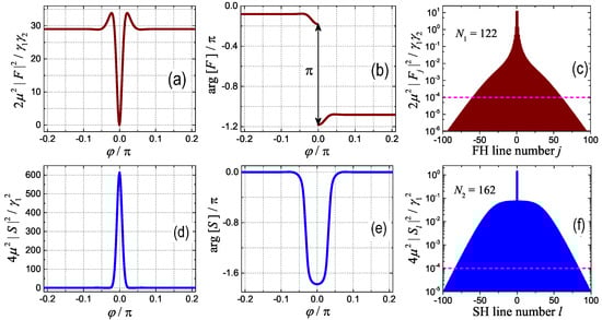 The FH and SH comb spectra are shown in Figure 8c and Figure 8f. They are symmetric in j and l and very broad. The normalizations of F and S are slightly different and specific for the SH pumping case. On the other hand, they provide the maximum values of and of the order of one. The shapes of the FH and SH spectra are notably different. The central peak in Figure 8f is due to the pump. To quantify the comb spectra, we define the number of significant FH and SH lines ( and ) whose normalized intensities are above the cut-off level . This characteristic is conditional and rather useful; the lines of this strength are typically well above the light noise. In our case, and correspond to the well developed dual combs.
