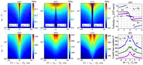 We start our report with the case of quasi-PM via the radial poling. Here, the pump wavelength can take practically any value. In particular, it can be made arbitrary close to the zero walk-off point nm. This case is especially important. For sufficiently small values of , the group velocity difference is given by in accordance with Figure 4a. Correspondingly, for nm and typical values of R and , the walk-off parameter ranges from 0 to large negative and positive values, while the dispersion coefficients stay practically constant and opposite in signs, , .