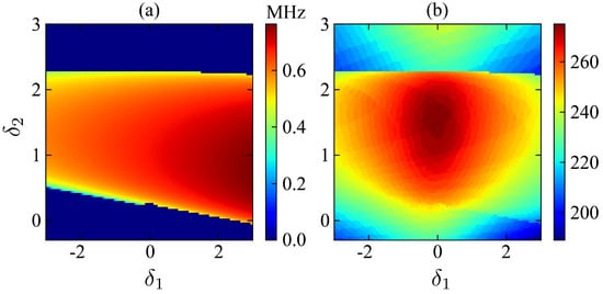 The structure of Equation (8) gives a hint about the normalization of parameters relevant to the linear properties of the system. Such a normalization enables one to decrease the number of variable parameters. In what follows, we will use the following normalized detunings, walk off, and dispersion parameters , , and :