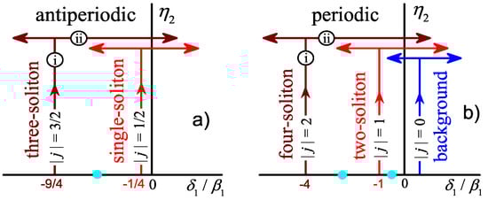 Using Equations (3), (5) and (7) and introducing the rim coordinate , one can make sure that the periodic and antiperiodic states obey the same set of nonlinear equations for any phase-matching scheme [,]: