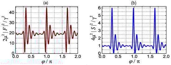 Below we report the results on soliton–comb generation obtained by using our adiabatic procedure in the SH pumping case for LN resonators [,]. The -dependences of , , , and and the spectra and are of our prime interest. Additionally, we are interested in the dependences of the soliton–comb characteristics on the pump amplitude , the walk-off parameter , and other variable parameters of the system. Generally, the soliton position in the resonator depends on the choice of the initial random amplitudes. Since the azimuth angle can be counted from any point, we can chose its zero point as convenient.