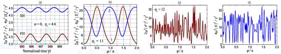 One more important property of set (8) is the presence of spatially uniform steady-state background solutions , []. In the steady state, and . Obviously, such a dual background is possible only for the periodic states. The dual background is closely related both to the properties of the solitons and to the thresholds of the instabilities leading to soliton–comb formation. Omitting all derivatives in (8), one can easily come to a closed algebraic equation for that is, however, different for the FH and SH pumping cases. We have and for the FH and SH pumping cases, respectively. The dependence of on the pump amplitudes is presented graphically in Figure 5. In both pumping cases, the dependence of is controlled by the phase , such that multivalued solutions exist for sufficiently small . These dependences can be interpreted in the terms of the bifurcation theory []. This theory cannot, however, provide useful insights into the properties of light states well above the instability thresholds because of a very large number of the FH and SH light harmonics.