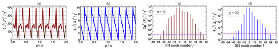 It is not difficult to estimate the numbers of light quanta and in the FH and SH modes for the data of Figure 8c and Figure 8f. Using Equation (4) for and setting m, we have found that they are roughly of the order of for . Thus, we are deeply within the classical range. This is valid also for the subsequent illustrations. At the same time, far tails of the comb spectra can experience quantum effects.