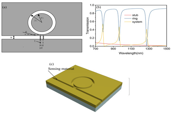 (a) Schematic of the proposed MIM optical sensor. (b) Transmittance spectrum when the dielectric n = 1.36. The red, blue, and yellow lines represent the transmittance spectrum of the stub, the ring resonator, and the system, respectively. (c) The 3D schematic of the proposed structure.