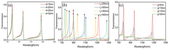 (a) Transmittance spectrum for stub distance from d = 15 nm to d = 30 nm. (b) Transmittance spectrum for ring resonator radius from r2 = 250 nm to r2 = 400 nm. The red, yellow, blue, and green lines represent radii from 250nm to 400nm at intervals of 50nm, and the dots of the circle, triangle, diamond, and pentagonal represent the second, third, fourth, and fifth order annular cavity mode field resonance wavelengths, respectively. (c) Transmittance spectrum for coupling distance from g = 5 nm to g = 20 nm.