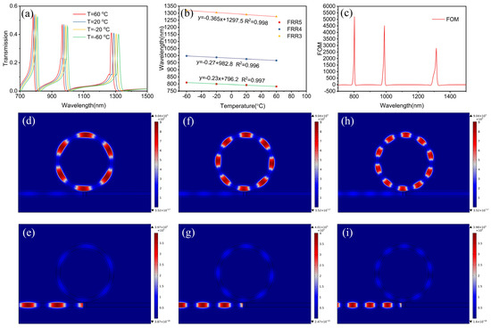 (a) Transmission spectrum of the proposed temperature nanosensor, when the MUS area is filled with ethanol and ambient temperature T, is from −60 °C to 60 °C at 40 °C intervals. (b) The linear relationship fit for temperature versus resonance wavelength of FR3, FR4, and FR5. (c) The FOM of the proposed nanosensor. (d) FR3, λpeak = 1290 nm. (e) FR3, λvalley = 1330 nm. (f) FR4, λpeak = 976 nm. (g) FR4, λvalley = 1002 nm. (h) FR5, λpeak = 792 nm. (i) FR5, λvalley = 812 nm.