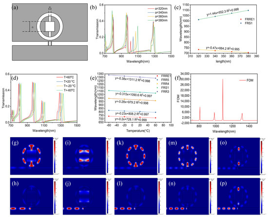 (a) Schematic of the coin-like resonator based on MIM structure. (b) Transmission spectrum for square resonator length a from 320 nm to 380 nm. (c) The linear relationship fit for resonator length versus resonance wavelength of FRRE1 and FRS1. (d) Transmission spectrum of the coin-like nanosensor when the temperature T is from −60 °C to 60 °C at 40 °C intervals. (e) The linear relationship fit for temperature versus resonance wavelength of FR3, FRS1, FR4, FR5, and FRRE1. (f) The FOM of the proposed coin-like sensor. (g) FR3, λpeak = 1288 nm. (h) FR3, λvalley = 1320 nm. (i) FRS1, λpeak = 1072 nm. (j) FRS1, λvalley = 1084 nm. (k) FR4, λpeak = 962 nm. (l) FR4, λvalley = 986 nm. (m) FR5, λpeak = 794 nm. (n) FR5, λvalley = 810 nm. (o) FRRE1, λpeak = 714 nm. (p) FRRE1, λvalley = 718 nm.
