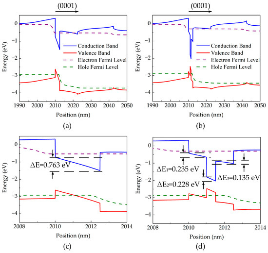 where x is the proportion of In content. The lattice constant of In0.3Ga0.7N is 0.324 nm, which is 8.47% smaller than that of InN. Hence, the InN layer provides tensile stress for the adjacent InGaN layers in SQW, which compensates the compressive stress caused by the mismatches between SQW and quantum barriers (QBs). Figure 2a,b show the energy band structure and quasi-Fermi levels of LED A and LED B at 60 A/cm2, respectively. It can be observed that the energy band profiles of the SQW in LED A and adjacent QBs are apparently bent due to the piezoelectric polarization. For the LED B, there is a slender pit in the middle of the energy band in SQW caused by InN IL. Figure 2c,d show the enlarged energy band diagrams near the SQW region of LEDs A and B, respectively. To quantitatively describe the degrees of band bending, the energy differences (labeled as ∆E) between the top and bottom energies of the SQW conduction band are shown in Figure 2c,d. As for LED A, the value of ∆E is equal to 0.763 eV, attributed to the piezoelectric polarization occurring between the SQW and QBs. Regarding LED B, the region of SQW can be divided into three parts. The energy differences of the conduction band between the three parts were labeled ∆E1, ∆E2, and ∆E3 (from n-side QB to p-side QB). The values of ∆E1, ∆E2, and ∆E3 were 0.235 eV, 0.228 eV, and 0.135 eV, respectively. The sum of ∆E1, ∆E2, and ∆E3 was 0.598 eV. Compared with LED A, the degrees of band bending in the SQW of LED B are apparently mitigated by InN IL. In addition, to precisely reflect the degrees of band bending in SQW, we calculated the value of energy difference per nanometer, which can be expressed as: