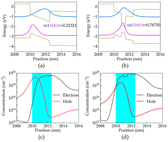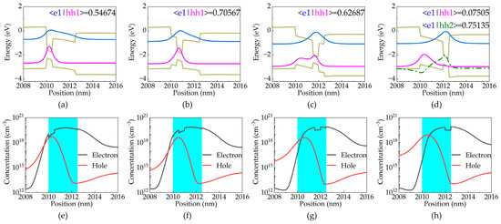 where q is the elementary charge, d is the QW thickness, and A, B, and C are the Shockley–Read–Hall, radiative, and Auger recombination coefficient, respectively. It can be noted from Equation (4) that as the carrier wavefunction overlap decreases, the carrier density increases instead, and this conclusion is confirmed in Figure 7h. When the distance between n-side QB and InN IL is 2 nm, a higher concentration of holes is observed compared to the other SQW with different positions of the InN IL. Hence, despite the reduced carrier wavefunction overlap, the presence of high hole concentration can still result in a considerable enhancement of the IQE. In addition, apart from the hh1 sub-band, other sub-bands may also have an impact on the radiative recombination in the SQW. For instance, the <e1|hh2> wavefunction overlap is up to 0.75135, as shown in Figure 7d.
