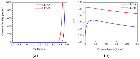 (a) I-V curves of LED A and LED B, respectively; (b) IQE versus current density curves of LED A and LED B.