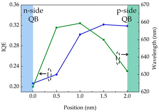 The curves of IQE and peak emission wavelength as a function of InN position at 60 A/cm2.