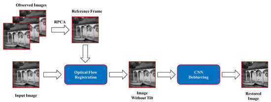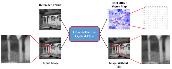 Due to the simultaneous existence of the and operators in Equation (1), the problem becomes difficult. If there is only , the problem become a deblurring. A common method is to remove the tilt using the reference frame and optical flow method. Equation (1) is simplified as
