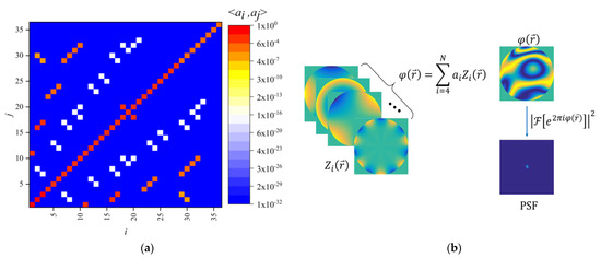 Each term of the Zernike polynomial is fixed, but the coefficient is variable. We need to determine the relationship between each coefficient that conforms to the laws of atmospheric turbulence. From the energy perspective, Noll [24] provides the covariance between any two Zernike polynomial coefficients and :
