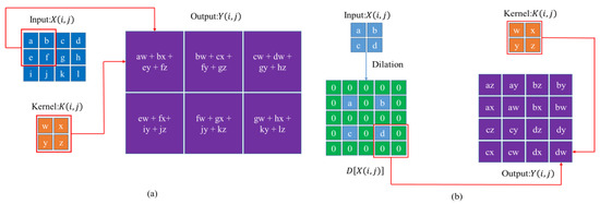 For a CNN, its foundation is the feature extraction technology of convolution. The specific implementation method is to perform convolution operations through convolutional (Conv) layer, as shown in Figure 7a. Let be input feature map, be the convolutional kernel. The output feature map that passes through a convolutional layer can be represented by the following function: