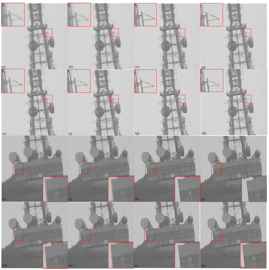 Comparison of restoration effects of actual observation images: (a,i) original observation images; (b,j)Optical flow registration images [4]; (c,k) Ours CNN; (d,l) Mao et al. [2] (Optical Flow + Lucky Fusion + Deconv);(e,m) Chen et al. [17] (CNN);(f,n) Fazlali et al. [18] (Lucky Fusion + CNN);(g,o) Hoffmire et al. [19] (Lucky Fusion + CNN); (h,p)Zhiyuan et al. [20] (CNN).
