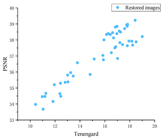 To demonstrate the correlation between Tenengard and PSNR, we plotted scatter plot of Tenengard and PSNR using simulated restored images, as shown in Figure 12. From Figure 12, there is a significant positive correlation between Tenengard and PSNR. It can also be considered that the larger the Tenengard of the restored image, the larger its PSNR may be, and the closer it is to the original clear image.