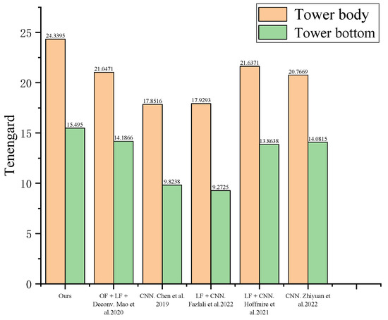 We calculate the Tenengard values for all images in Figure 11, as shown in Figure 13. Overall, our algorithm has slightly higher Tenengard values than other algorithms. In tower body images with a single content, our algorithm significantly improves the image.