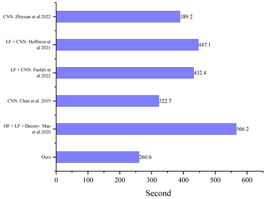 Presently, there are many algorithms for restoring turbulent degraded images, and most of them can achieve good results. However, many conditions limit the application of algorithms. The two main limitations are the demand for computing time and data volume. We have calculated the computational time required abovementioned algorithms to restore 100 images, as shown in Figure 14. From Figure 14, our algorithm has the shortest running time. We replaced the most time-consuming lucky image fusion and blind deconvolution with CNN. At the same time, the CNNs in our algorithm have smaller convolution kernels than other CNNs, and the number of convolutional layers is not particularly large.