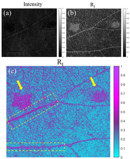 In Figure 3c, we see how some structures almost invisible to the standard intensity image (Figure 3a) are clearly observable. For instance, in Figure 3c, we observe how different structures present in the leaf have different polarimetric responses—in this case in the entrance retardance value, which is translated in a different value of RI. For instance, the pathological areas of the plant (see yellow arrows) present different retardance values than the rest of the healthy leaf lamina. That is, the structural changes produced in these necrotic areas of the leaf (see description in Section 4) produce a very different entrance retardance, RI, behavior which allows us to have a great contrast between the not infected part of the plant and the necrotic stage of the pathology. Moreover, we also can differentiate the vascular structure of the plant, especially the highlighted primary veins (see yellow dashed rectangles). Note how the stated visualization improvement can be of interest for characterization as well as the pathological analysis of plants.