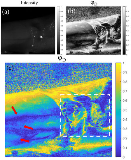 In Figure 4, we see the images correspondent to the tendon sample. Figure 4a shows the standard intensity image of a tendon which is partially enveloped by fascia and areolar fatty tissue (indicated by the symbol * in the figure). In the polarimetric image (Figure 4c), which in these cases corresponds with the azimuth of the diattenuation () observable, we are able to see structures almost not visible in the intensity channel (Figure 4a). In Figure 4b,c, we can appreciate a larger contrast between the fascia covering the right part of the tendon, where the different folds composing this structure have different azimuth values (see white rectangle in Figure 4). Moreover, the polarimetric channel also reveals a structure in the left part of the samples. These structures (see red arrows), hidden in the intensity image, are the boundaries between different fascicles inside the same tendon.