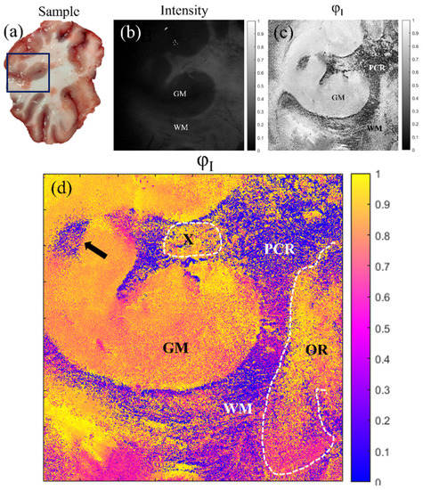 Finally, in Figure 5, we provide the results for a coronal section of a cow brain (see a photograph of the sample in Figure 5a). Once again, the comparison is set between the standard intensity image (Figure 5b) and the best results for polarimetric images (azimuth of the entrance retarder, ; Figure 5c,d). In this vein, in Figure 5a,b, we can see two different structures in the brain: gray matter (GM) and white matter (WM); which present different compositions and functions in the brain. However, in the polarimetric images (Figure 5c,d), we are able to distinguish information about the sample structure which is not visible in the intensity channel. Firstly, the boundaries of the WM and the GM are better observed in the image, where we can see a region of WM (see black arrow in Figure 5d) clearly contrasted (note that this WM region is not distinguished in the intensity image and can be misclassified as GM). Importantly, other interesting structures are revealed in the image. In particular, in Figure 5d we can identify fiber tracts of the subcortical WM classified according to their directionality. This allows tracing the borders between the longitudinal (at this level) parietal radiations of the corona radiata (PCR in the figure), optical radiations (transversal, OR in the figure; framed with white dashed lines in the right of the figure) and specific fascicles probably corresponding to the dorsal visual processing pathway (for example, X in the figure; framed with white dashed lines).