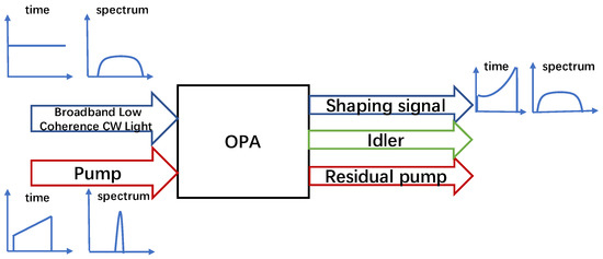 Our arbitrary shaping system scheme improves the effect of conventional shaping on broadband light as shown in Figure 1. In our scheme, the time shaping is realized in an OPA process. The pump light of the OPA is a narrowband light with an arbitrary time-shaping capability. The signal light of the OPA is a time-continuous broadband low-coherence seed source. The OPA process uses an LBO crystal to ensure that the pump and signal are incident at a phase-matched angle. The gain of the coupling process between the pump and the signal is related to the intensity of the pump. As the pump power varies with time, based on the OPA principle, the gain in the signal light also changes accordingly. The intensity distribution of the pump determines the signal intensity distribution and, therefore, indirectly shapes the temporal characteristics of the signal. By adjusting the time waveform of the pump light, the ability to control the time waveform of the signal light is obtained.