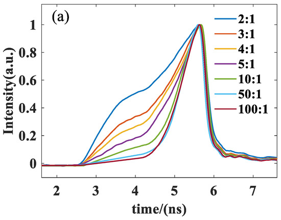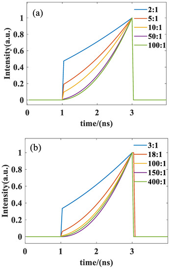 In most nanosecond laser pulse-driven ICFs, the time shaping of the seed source requires the output of pulses with a certain time–waveform contrast considering the necessity for gain saturation in subsequent systems and the target compression process in physical experiments [14]. The time-shaping contrast is defined as the intensity ratio between the highest and the lowest power of the shaped time waveform, which is typically in the order of several hundred to one [14]. We simulated the shaping of signal pulses by modulating the pump under various time-shaping contrast conditions as shown in Figure 2. When the time-shaping contrast of the pump is 2:1, the time-shaping contrast of the output shaped signal is 3:1 while the time-shaping contrast of the pump is 100:1, and the contrast ratio of the output pump is 400:1. We observed that the shaped output pulse responded to the shape and time waveform contrast of the pump. An output signal with an arbitrary waveform was obtained by modulating the pump. It shows that the scheme can be used to obtain high time-shaping contrast signal light and can obtain amplified output pulses with flexible time-shaping contrast, which can be applied to a wide range of high-power laser experiments.