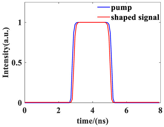 In current high-energy laser experiments, rising edges in the order of several hundred picoseconds are generally required [27]. The fast response time also affects the rising edge speed and shaping ability. Theoretically, OPA has the advantage of a short response time. We simulated fast-rising-edge low-coherence pulse shaping as shown in Figure 3, where the rising edge of the pump was 100 ps and the rising edge of the shaped signal was 65 ps. This demonstrates that our system has the advantage of a faster rising edge and can obtain a rising edge with a magnitude of picoseconds, which satisfies current ICF experimental requirements. According to the OPA principle, the response time of the rising edge of the shaped signal light is related to the response time of the nonlinear process, which can be as short as a few femtoseconds, and the rising time of the pump light. The rising time of the pump light is only limited by conditions that are considerably larger than the response time of the parametric process.