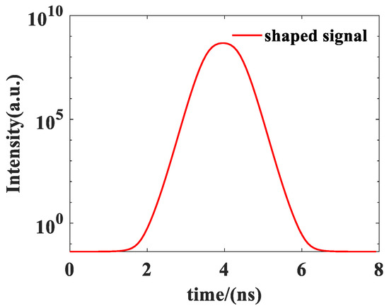 Meanwhile, the signal-to-noise ratio is important in arbitrary time shaping and is required to be approximately 40 dB within a few nanoseconds before the pulse [14]. Our OPA-based time-shaping scheme provides a high signal gain owing to its inherent properties and thus has a higher signal-to-noise ratio than other schemes, such as saturable absorption effects [17]. We demonstrated a shaped signal generated with a pump intensity of 2.5 GW/cm2 and a signal intensity of 1 W/cm2, as shown in Figure 4. There was a signal-to-noise ratio of over 108, which continued to improve as the pump intensity increased in the unsaturated case. This demonstrated that the proposed solution has the advantage of a high signal-to-noise ratio.