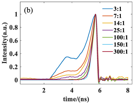 To verify the shaping capability of our arbitrary time-shaping scheme based on the OPA, we injected pump pulses of different time waveform contrasts into the system and observed the time-shaping contrast of the shaped pulses. We used an AWG to generate 1064 nm seed pulses with different time waveform contrasts. The seed pulses were amplified using a solid amplifier and then passed through the frequency doubling system to output a pump pulse of 532 nm. The time waveform contrast of the pump pulse was from 2:1 to 100:1, and an oscilloscope and PIN detector were used to measure the pump after attenuation (Figure 8a) and the shaped signal time profile (Figure 8b). The shaped signal responded well to the intensity waveform of the pump. The signal could be shaped by adjusting the pump waveform. The OPA-based time-shaping scheme presents a significantly higher time-shaping contrast and can exceed the maximum pulse time-shaping contrast of 300:1 within the measurement accuracy range compared with other schemes, such as the 17:1 achievable with saturable absorbers [17]. The experiments showed that the time-shaping contrast of the shaped signal pulse can be controlled by changing the intensity and time waveform contrast of the pump, illustrating the flexibility and controllability of the OPA-based time-shaping scheme in ASE broadband arbitrary time shaping.