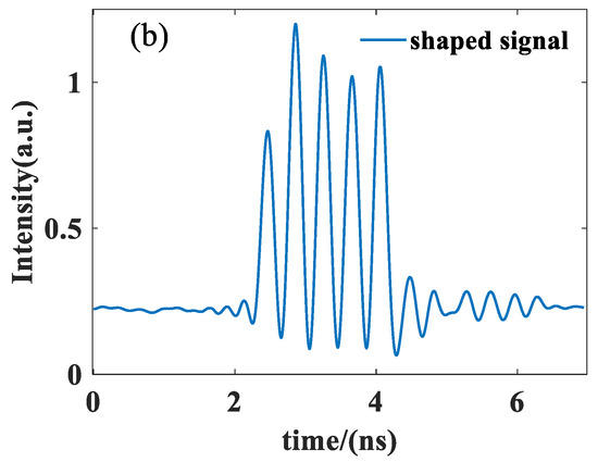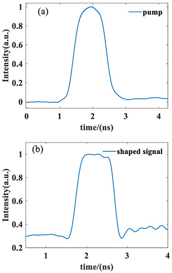 In high-power laser physics experiments, various arbitrary shapes are often required; therefore, adaptation to various physical requirements is also an indication of shaping capability. We obtained a short-pulse pump of 200 ps by adjusting the AWG and shaping a signal pulse with a pulse width of 180 ps (Figure 10a). The pump shape was adjusted to a comb pulse with a period of 200 ps. We obtained a comb-shaped signal pulse with a period of 200 ps (Figure 10b). It responded exactly to the shape of the pump. This demonstrated that the proposed scheme can be adapted to a wide range of physical waveforms.