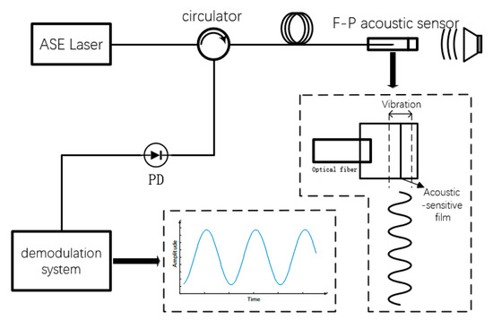 The research based on fiber optic F-P acoustic sensors has made significant progress. For instance, the work of Yu et al. [3,4] focused on studying the F-P acoustic sensor system’s ability to detect weak acoustic waves of partial discharge, analyzing its measurement sensitivity, and demonstrating the passive and high-frequency response of the fiber optic acoustic sensor. Similarly, Akkaya, Jo et al. [5,6] investigated F-P acoustic sensors utilizing a photonic crystal film as the acoustic-sensitive film, analyzing its displacement sensitivity, and proposing an electromechanical model for the sensor. Recently, Zhang et al. [7] proposed a four-wavelength demodulation technology for F-P acoustic sensors, resulting in a higher noise ratio in the demodulated signal. These studies primarily focused on sensor and algorithm design and the front-end and back-end research in the sensing system but rarely discussed the sensing link and its signal-to-noise ratio.