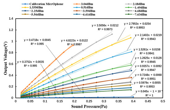 Figure 4 depicts the output voltage of the fiber optic F-P acoustic sensing system at 11 different laser powers, compared to a standard electrical microphone with a sensitivity of 45 mV/Pa. When increasing the sound pressure, if the voltage no longer increases or even decreases, it indicates that the system output is out of the linear range and this part of the output should not be taken into account. It is evident that as the input optical power increased, the acoustic response sensitivity also increased. However, the linear range became smaller at high optical powers. Figure 5 shows the output voltage of the sensing system when there is no sound, which can be considered as the inherent noise of the system. Increasing the optical power also led to an increase in scattered noise, which increased the overall system noise [12]. After substitution into Equation (8), the obtained signal-to-noise ratio was compared with the model simulation results in Figure 6.