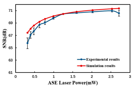From Equation (7), it is known that different optical powers lead to different system signal-to-noise ratio outputs for a fixed device. The optical power was adjusted during the test to facilitate comparison with the model simulation results.