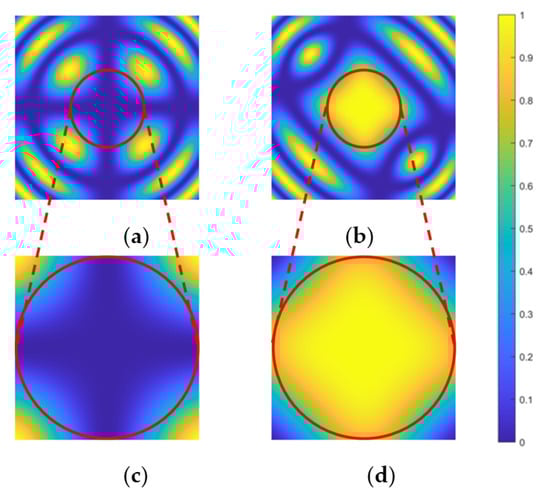 In order to verify the accuracy of the compensation method, a pure white plate is placed 22.04 m away from the receiving system, and a gated imaging experiment on the white plate is conducted. The effect of imaging compensation is shown in Figure 9. From Figure 9a, we can see that because the physical principle of the crystal as an optical switch is the conoscopic interference effect of the crystal, only the area of about 301 301 pixels in the center of the field of view can achieve uniform imaging. Figure 9c,d are the contrast images of the imaging effect of the 601 601 pixel range area of the crystal center before and after compensation. From the image effect before and after compensation, it can be seen that in the pixel area taken, the gray image uniformity of the target imaging is significantly improved, proving the algorithm’s accuracy.