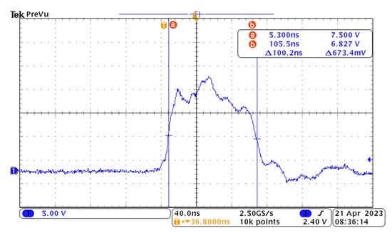 In order to calculate the inhomogeneity caused by pulse voltage, the pulse voltage applied to the electro-optical crystal should be measured with an oscilloscope. It can be seen from the measurement results below that the pulse width of the applied voltage source used in this research group is 100 ns.