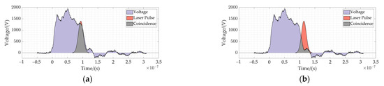 Temporal relationship between the laser pulse and the voltage applied to the crystal. The purple region represents the laser pulse voltage, the orange region represents the laser pulse, and the gray region represents the coincidence region of the laser pulse and voltage applied to the crystal. (a) indicates that the laser pulse and the applied pulse voltage are completely coincident. (b) indicates that the laser pulse partially leaves the applied pulse voltage of the crystal.