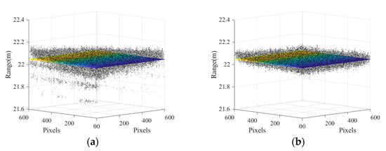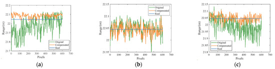 Figure 11 are the distance depth maps of the flat target obtained by the system before and after compensation. Figure 12 shows the comparison of the distance depth with the horizontal row of pixels, where the orange curve represents the distance depth curve in Figure 11b, the green curve represents the distance depth curve in Figure 11a, and the blue line represents the true distance of the target. Figure 12a–c represent the average distance depth of the first to fifth rows of pixels in Figure 11, the average distance depth of the 299th to 303rd row of pixels, and the average distance depth of the 597th to 601st rows of pixels, and these pixels are marked with solid black translucent lines, respectively, in Figure 12a,b. From Figure 10, Figure 11 and Figure 12, we can conclude that due to the influence of the inhomogeneity of the electro-optical crystal switch, the calculated value of the distance depth is generally smaller than the true value in the upper-left and lower-right parts of the distance depth image calculated by the original slice image, while the calculated value of the distance depth is generally larger than the true value in the lower-left and upper-right parts of the image. Additionally, there are obvious isolated points at the edge of the point cloud image. The range accuracy of the depth image restored by the compensated slice image is significantly improved in the corner part; the tilt phenomenon is obviously suppressed; the isolated points of the image in the edge part are significantly reduced; and the image dispersion in the center part is reduced. This result verifies the accuracy of the compensation method.