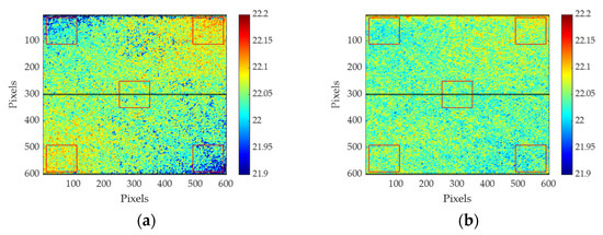 In the formula, represents the standard deviation of distance depth, n represents the total number of pixels, represents the distance corresponding to the ith pixel, and represents the actual measured target distance with a fixed value of 22.04 m. After calculation, the standard deviations of the distance depth corresponding to Figure 11a,b are 3.86 cm and 2.86 cm, respectively. Additionally, the standard deviations of the distance depth of the areas marked with red boxes in the upper-left, upper-right, lower-left, lower-right, and central field of view in Figure 11a are 4.26 cm, 3.18 cm, 2.71 cm, 5.05 cm, and 2.69 cm, respectively, and in Figure 11b, the standard deviations are 2.53 cm, 2.38 cm, 2.56 cm, 2.81 cm, and 2.30 cm, respectively. Among them, the standard deviation of the distance depth of the marked area in the upper-left and lower-right parts decreased significantly, indicating that the tilt phenomenon caused by the crystal switch was significantly suppressed, which verified the accuracy of the compensation method. The leading causes of range error are as follows: First, the pulse voltage applied to the crystal is not an ideal pulse, and its peak waveform stability is poor. In this case, there will be errors when the sequence image weighted average method is used to recover the distance depth. Second, the principle of the crystal as an optical switch is the conoscopic interference effect of the crystal. The conoscopic light interference effect itself has inhomogeneity, and there will be a significant error at the edge of the field of view. Third, the jitter time of the TDG triggering the crystal pulse voltage is 25 ps according to the product manual, and the corresponding ranging error is 0.38 cm. The shot noise of SCMOS will also cause a particular distance error. After compensation, the influence of the first and second reasons is obviously suppressed, and the standard deviation of system distance depth is obviously improved.