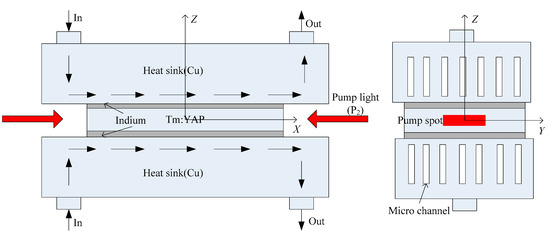 where kx, ky, and kz are the thermal conductivities of the Tm:YAP along the x, y, and z-axis, respectively, ρ is the density and c is the heat capacity. A thin indium layer (no more than 50 μm) is sandwiched between the Tm:YAP cooling surface and the heat sink to ensure good thermal contact. The heat sink is assumed to dissipate the heat quickly enough, which means that the boundary condition of the two big surfaces is:
