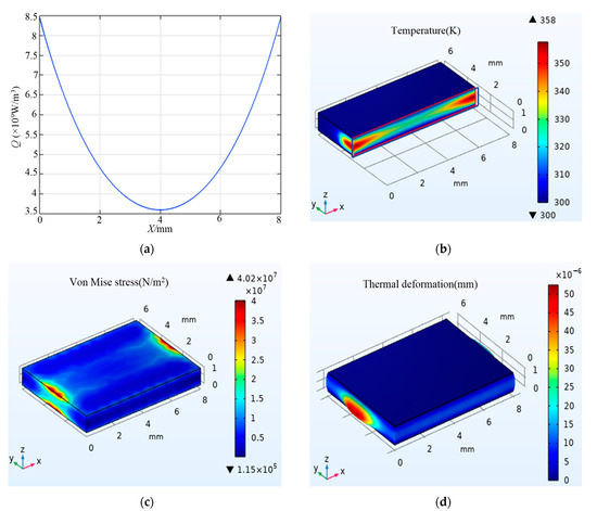 The model of the laser diode- (LD) pumped Tm:YAP crystal is established based on the Cartesian coordinate system. As shown in Figure 1, the pump light enters the Tm:YAP slab from the two end faces along the x-axis. When the pump laser is transmitted in the laser slab, the pump energy is gradually absorbed by the crystal. Assuming the spatial distribution of the pump light is flat-top, the heat distribution inside the double-end-pumped Tm:YAP crystal can be expressed as: