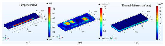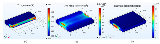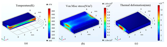 The thermal effect under different pump power is also calculated when other conditions remain unchanged. Figure 3 and Figure 4 show the distribution of temperature, stress, and thermal deformation when the single-end pump power is 300 W and 500 W. The maximum temperature increases to 474 K and 589 K, respectively, with the single-end pump power of 300 W and 500 W. Accordingly, the maximum thermal stress is 1.05 × 108 N/m2 and 1.7 × 108 N/m2. Moreover, the maximum deformation of the end face is 1.3 × 10−4 mm and 2.2 × 10−4 mm.