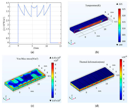 The heat power density (a), temperature (b), stress (c), and thermal deformation (d) distribution inside the Tm:YAP with a pump power of 100 W from each end face.