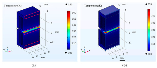 In the previous calculation, the boundary condition of the two large faces are set to a constant temperature, which is equal to the cooling temperature. In the actual thin-slab structure, the heat inside the crystal is generally taken away by the heat sink. According to the previous research results [17], a micro-channel heat sink which is made of copper with a thermal conductivity of 401 W/mK is designed as shown in Figure 8. The indium layer between the Tm:YAP to the heat sink is very thin and the heat is transferred very quickly from the Tm:YAP to the heat sink. Therefore, in the finite element analysis, the indium layer is neglected. The size of h1 and h2 are 0.5 mm and 6 mm, respectively. The sum of the channel width (t1) and rib width (t2) is 1 mm. The duty cycle (t) is defined by t = t1/(t1+ t2) to optimize the ratio of the channel width and rib width. Forced water convection used in the micro-channel to exchange heat with the convection heat transfer coefficient is 15,000 W/m2 K. Figure 9a shows the temperature distribution of the Tm:YAP cooled by heat sink with a duty cycle of 0.4. Comparing Figure 2b and Figure 9a, the temperature distribution in the Tm:YAP crystal is similar. The maximum temperature increases by 5 K. In order to obtain a better heat dissipation effect, the micro-channel width is reduced while keeping the duty cycle unchanged. Figure 9b shows the temperature distribution in Tm:YAP with a micro-channel width of 0.2 mm. When the duty cycle is kept constant, the number of micro-channels is doubled, and the temperature distribution is closer to Figure 2b, which indicates that the micro-channel structure has sufficient cooling capacity for high-power thin-slab Tm:YAP crystal.