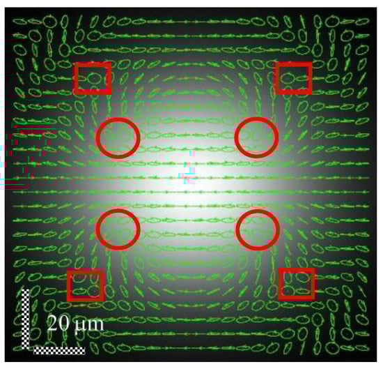 When a linearly polarized beam () propagates along the optical axis of the crystal, the field decomposes, due to diffraction on the crystal lattice, into components with circular polarization, which form the characteristic pattern of polarization features shown in Figure 1. From the map of polarization states shown in Figure 1, it can be seen that the field near the beam axis is linearly polarized. At the same time, the peripheral regions of the field have a complex polarization composition. Four areas close to the axis are clearly distinguished, forming lemon-type polarization singularities [21]. The topological index of different polarization singularities is additive: a loop taken around multiple singularities will give an index equal to the sum of the indices of the individual singularities. Orientation ambiguity occurs at circular polarization states called C-points. C-points in particular come in three generic types: lemons with index , stars with index , and monstars with index . The monstar is a less common transition singularity formed in creation and annihilation events between singularities.