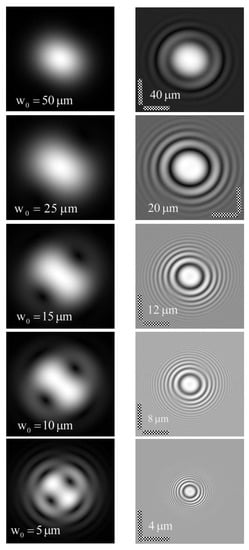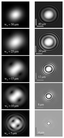 Typical pictures of the distribution of optical vortices in the beam components are shown in Figure 2 and Figure 3. In order to identify the sign of the vortex charge in adjacent columns, interference patterns are shown. Each row in the column corresponds to the original beams with different waist radii. As can be seen from the figures, the structure of singularities in the beam does not depend on its waist, but on the position of optical vortices on rays with charges . The smaller the beam waist radius, the closer the position of the optical vortices to the beam axis. It can be concluded from the form of interference patterns that each quadruple of vortices forms a characteristic topological quadrupole for monochromatic [22] and polychromatic [23] beams. The vortices lying on the rays and have opposite topological charges. In addition, the optical vortices in the circularly polarized components are specularly reflected with respect to each other. That is, the vortices lying on the same beam have opposite signs of the topological charge.